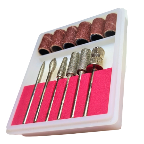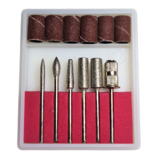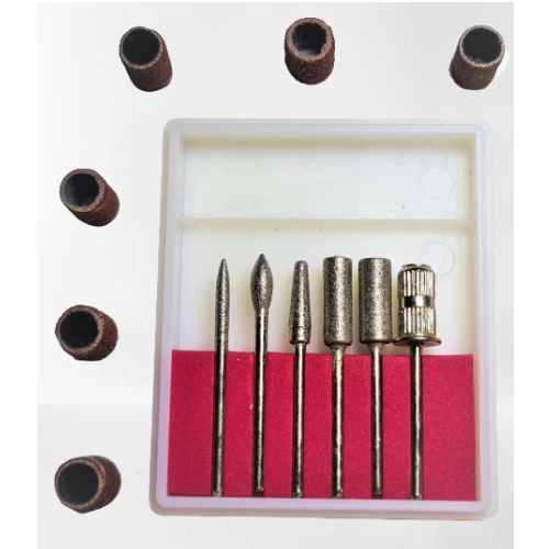 Contine o freza cu varf pentru cuticule , un capat in forma de lacrima , o freza forma conica si 2 freze cilindrice cu dimensiuni diferite, 1 suport pentru inele de smirghel , 2 inele de smirghel # 120, 2 inele de smirghel # 180 si 2 inele de smirghel # 240.